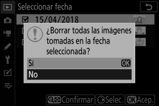 Para borrar todas las imágenes no protegidas capturadas en las fechas seleccionadas, elija Borrar > Seleccionar fecha en el menú reproducción y siga los pasos indicados a continuación.