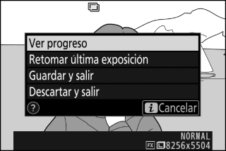 Para finalizar una exposición múltiple antes de capturar el número especificado de exposiciones, seleccione Desactivado para Modo exposición múltiple o pulse el botón K y el botón i y seleccione Guardar y salir o Descartar y salir. Si los disparos finalizan o selecciona Guardar y salir antes de alcanzar el número de exposiciones especificado, se creará una exposición múltiple con las exposiciones grabadas hasta el momento. Si Media es seleccionado para Modo superposición, la ganancia se ajustará para reflejar el número de exposiciones registradas hasta la actualidad. Tenga en cuenta que los disparos finalizarán automáticamente si el temporizador de espera expira.