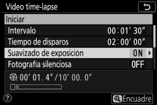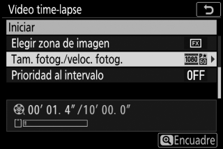 - Tam. fotog./veloc. fotog.: Elija el tamaño de fotograma y la velocidad de fotogramas para el vídeo final. Las opciones son las del elemento Tam. fotog./veloc. fotog. del menú disparo vídeo.