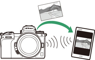 Use SnapBridge para controlar la cámara de forma remota desde un dispositivo inteligente y descargar imágenes de la cámara.