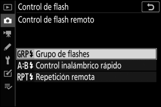 Después de seleccionar AWL radio para Control de flash > Opciones flash inalámbrico en el menú disparo foto, seleccione Grupo de flashes, Control inalámbrico rápido o Repetición remota para Control de flash remoto y configure los ajustes tal y como se describe a continuación.
