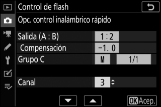 Seleccione esta opción para controlar la compensación general del flash y el equilibrio relativo entre los grupos A y B, mientras configura el destello del grupo C manualmente.
