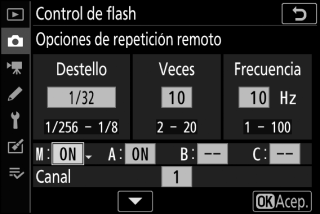 Seleccione el nivel de flash (Destello), el número máximo de veces que los flashes dispararán (Veces) y el número de veces que los flashes dispararán por segundo (Frecuencia).