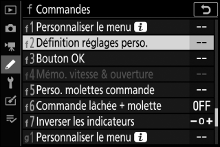 Dans le menu Réglages personnalisés, mettez en surbrillance le réglage personnalisé f2 (Définition réglages perso.) et appuyez sur J (pour obtenir des informations sur l’utilisation des menus, reportez-vous à « Commande G », 0 Commande G).