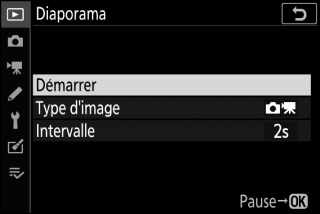 - Quitter et revenir au menu Visualisation : appuyez sur G pour arrêter le diaporama et revenir au menu Visualisation.