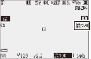 Lorsque le bracketing est activé, une icône de bracketing, un indicateur d’avancement du bracketing et le nombre de vues restantes s’affichent. Après chaque prise de vue, un segment disparaît de l’indicateur et une vue est soustraite au nombre de vues restantes.