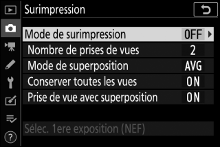 Mettez en surbrillance Surimpression dans le menu Prise de vue photo et appuyez sur 2.