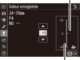 Valeur enregistrée : affinez l’AF pour l’objectif actuellement utilisé. Appuyez sur 1 pour éloigner le foyer de l’appareil photo ou sur 3 pour le rapprocher ; choisissez une valeur comprise entre –20 et +20. L’appareil photo peut enregistrer des valeurs pour 30 types d’objectifs maximum. Une seule valeur peut être enregistrée par type d’objectif.