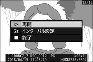 再生が終わると、メニューが表示されます。[再開]を選んでJボタンを押すと、スライドショーが再開します。[終了]を選んでJボタンを押すと、スライドショーが終了します。