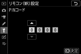 任意の数字4桁のPINコードを入力できます。マルチセレクターの42で桁を選んで、13で数値を変更します。Jボタンを押すと設定が変更され、画面に設定したPINコードが表示されます。