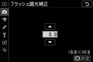 - 調光補正を解除するには、補正量を0.0にしてください。カメラの電源をOFFにしても、補正量の設定は解除されません。