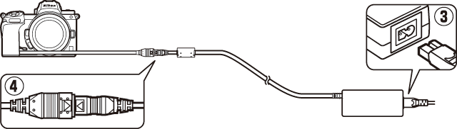 パワーコネクターEP-5B、ACアダプターEH-5c/EH-5b※ ACアダプターを使用すると、長時間カメラを使用するときに安定して電源を供給できます。 このカメラは、カメラ本体とACアダプターを接続するためにパワーコネクターEP-5Bが必要です。カメラとパワーコネクター、ACアダプターを接続する方法については、「カメラとパワーコネクター、ACアダプターの接続方法」(0カメラとパワーコネクター、ACアダプターの接続方法)をご覧ください。 日本国外でお使いになるには、別売の電源コードが必要です。 |