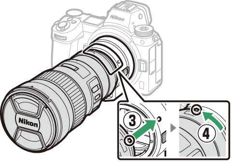 - レンズを取り付けるときは、マウントアダプターのレンズ取り外しレバーやカメラのレンズ取り外しボタンを押さないようにご注意ください。