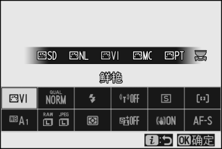 按下J选择加亮显示的项目。按下G按钮则不进行选择直接退出。若要退出菜单并返回拍摄模式,请半按快门释放按钮。