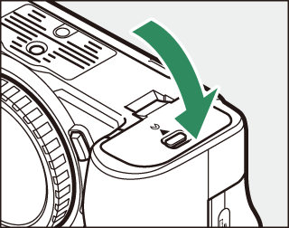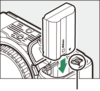 若要取出电池,请关闭照相机并打开电池舱盖。如箭头所示方向按电池锁闩以释放电池,然后用手取出电池。
