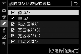选择当AF区域模式指定给i菜单或照相机控制时,可通过旋转副指令拨盘进行选择的选项。加亮显示所需模式并按下2确定选择或取消选择。设定完成后,按下J即可保存更改。