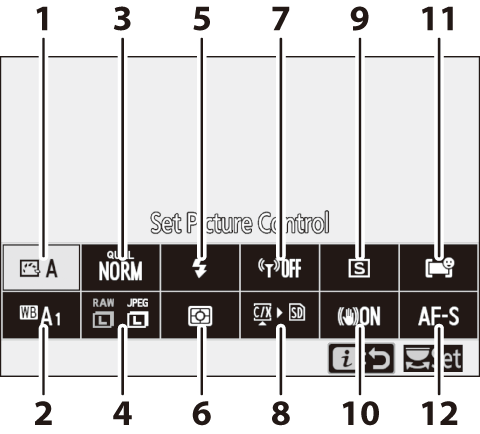 Zvýrazněním [ ] v menu i a stisknutím J zobrazíte seznam Picture Control . Zvýrazněte Picture Control a stiskněte 3 pro zobrazení náhledu efektu na displeji.