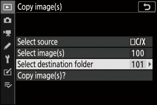 Po zadání čísla složky nebo zvýraznění názvu složky stisknutím J vyberte složku a vraťte se do nabídky [ Copy image(s) ].