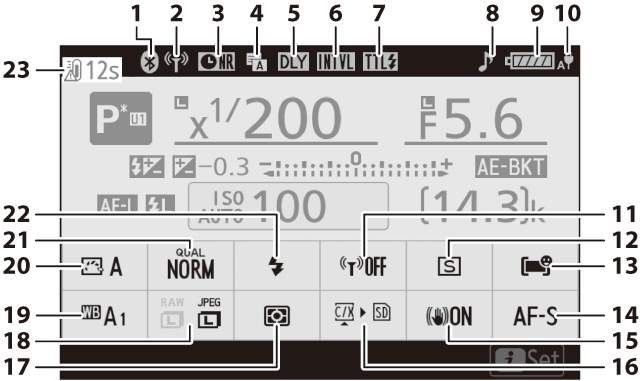 Indikátor expozice a zábleskového bracketingu ( expoziční a zábleskový bracketing ) Indikátor vyvážení bílé (WB bracketing) Indikátor bracketingu ADL ( ADL Bracketing ) Indikátor HDR ( pořizování HDR fotografií ) Indikátor vícenásobné expozice ( vytvoření vícenásobné expozice ) |
