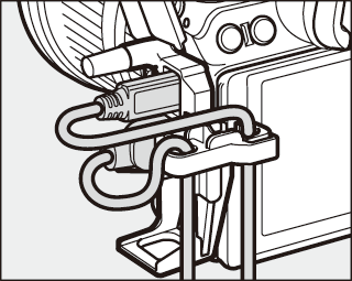 Abyste předešli náhodnému odpojení, připojte dodanou sponu ke kabelům USB nebo volitelným kabelům HDMI podle obrázku (všimněte si, že svorka nemusí pasovat na všechny kabely HDMI třetích stran).