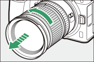 Šošovky s výsuvnými tubusmi musia byť pred použitím vysunuté. Otáčajte prstencom zoomu objektívu podľa obrázka, kým objektív nezapadne do vysunutej polohy.