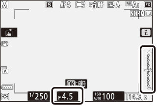 Indikátory expozície na monitore a v hľadáčiku ukazujú, či by bola fotografia pri aktuálnych nastaveniach podexponovaná alebo preexponovaná. Indikátory expozície je možné čítať nasledovne (zobrazenie sa mení podľa možnosti vybratej pre užívateľské nastavenie b1 [ ]):