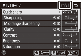 Zvýraznite existujúci Picture Control a stlačením 2 zobrazte možnosti úprav.