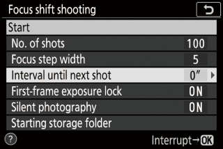 Fotoaparát zhotovuje fotografie vo vybranom intervale, počnúc vzdialenosťou zaostrenia zvolenou na začiatku snímania a postupuje smerom k nekonečnu podľa zvolenej vzdialenosti kroku zaostrenia pri každom zábere.
