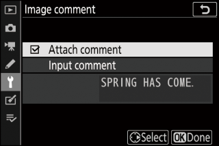 Ak chcete pripojiť komentár k ďalším fotografiám, zvýraznite [ ], stlačte 2 a skontrolujte, či sa v susednom začiarkavacom políčku zobrazuje začiarknutie ( M ). Stlačte J pre uloženie zmien a ukončenie; komentár bude pripojený ku všetkým nasledujúcim fotografiám.