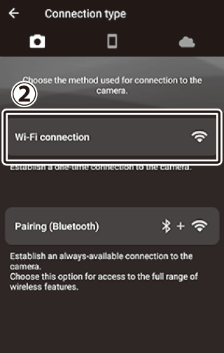 Na bezdrôtové pripojenie medzi fotoaparátom a inteligentným zariadením použite aplikáciu SnapBridge . Môžete sa pripojiť buď cez Wi-Fi ( Pripojenie cez Wi-Fi ( Režim Wi-Fi ) ) alebo Bluetooth ( Pripojenie cez Bluetooth ). Pripojenie pomocou Bluetooth umožňuje automatické nahrávanie obrázkov hneď po ich zhotovení.