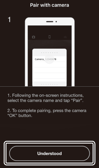 Chyba párovaniaAk medzi stlačením tlačidla na fotoaparáte a klepnutím na tlačidlo na zariadení so Android čakáte príliš dlho, zariadenie zobrazí chybové hlásenie a párovanie zlyhá. Klepnite na [ ] a vráťte sa na krok 2.