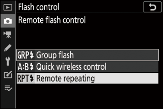 Vyberte režim ovládania blesku a úroveň blesku pre hlavný blesk a diaľkovo ovládané blesky v každej skupine.
