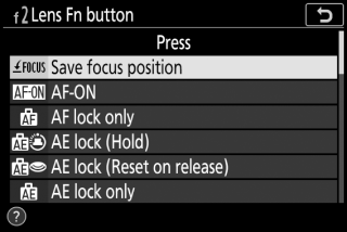 Vyvolanie pamäte je dostupné len vtedy, keď je na fotoaparáte namontovaný objektív s bajonetom Z s automatickým zaostrovaním a tlačidlami Fn a Fn2 . Ak objektív nie je vybavený tlačidlom Fn2 , fotoaparát nemôže uložiť polohu zaostrenia, aj keď je tlačidlo [ ] priradené tlačidlu Fn na objektíve.