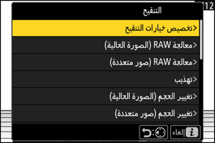 | [معالجة RAW (الصورة الحالية)] | احفظ نسخة من صورة NEF (RAW) الحالية بتنسيق آخر مثل JPEG (0معالجة RAW). |