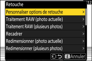 | [Traitement RAW (photo actuelle)] | Enregistrez une copie de la photo NEF (RAW) actuelle dans un autre format comme le JPEG (0 Traitement RAW). |