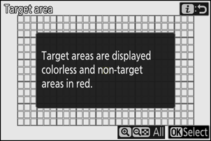 | [ Célterület ] | Válasszon egy területet a témaérzékeléshez, ha az [ Automatikus AF mező ] van kiválasztva AF mező módként. Az automatikus rögzítés akkor indul el, ha a célterületek (pontok) bármelyikében a feltételeknek megfelelő témát érzékeli a rendszer. A célterület-kiválasztással letilthatók a kép azon területei, amelyeket akadályok takarnak el, vagy amelyeket a témaérzékelés során más módon figyelmen kívül lehet hagyni, így biztosítva, hogy a kívánt téma megbízhatóbban érzékelhető legyen. |