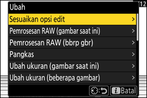 | [Pemrosesan RAW (gambar saat ini)] | Simpan salinan gambar NEF (RAW) saat ini dalam format lain seperti JPEG (0 Pemrosesan RAW). |