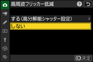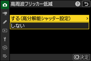 静止画撮影メニュー[高周波フリッカー低減]>[する(高分解能シャッター設定)]で[PRE1]~[PRE4]を選んでマルチセレクターの2を押すと、周波数を調整できます。