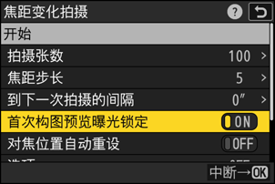 加亮显示[首次构图预览曝光锁定]并按下2选择[ON]或[OFF]。