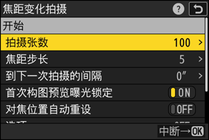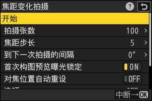 | [开始] | 开始拍摄。照相机将拍摄所选张数的照片,并在每次拍摄中以所选量改变对焦距离。 |