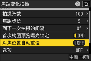 加亮显示[对焦位置自动重设]并按下2选择[ON]或[OFF]。