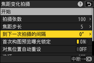 - 照相机将以所选间隔时间拍摄照片,并在每次拍摄中从开始拍摄时所选的对焦距离开始,按所选焦距步长距离逐步达到无穷远。