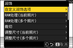 | [RAW处理(当前照片)] | 以JPEG等其他格式保存当前NEF(RAW)照片的副本(0 RAW处理)。 |