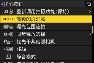 使用自定义设定f2[自定义控制(拍摄)]将[高频闪烁消减]指定给一个控制。