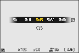 若要以15、30、60或120fps的每秒幅数进行高速连拍(高速画面捕捉+),请按住c按钮并旋转主指令拨盘选择[C15]、[C30]、[C60]或[C120]。