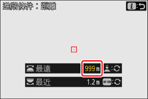 - [拍攝條件] > [距離] 啟用(M):相機對焦於為 [最遠] 所選的距離處。