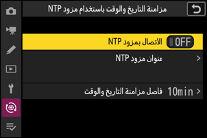 | [فاصل مزامنة التاريخ والوقت] | حدد الفاصل الزمني الذي تَستَخدمه الكاميرا للحصول على التاريخ والوقت من مزود NTP من [دقيقة]، [10 دقائق]، و[60 دقيقة]. |