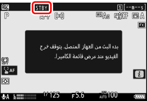 • ستظهر شاشة تصوير وضع الفيديو بغض النظر عن الإعداد المحدد لزر اختيار الصور/الفيديو. سيتم تطبيق إعدادات وضع الفيديو بما في ذلك توازن البياض وإعداد برنامج التحكم بالصورة Picture Control على صورة البث.