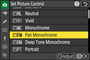 - [ Плоски монохром ] и [ Дълбочинен монохром ] също са добавени към оригиналния Picture Control , на който е базиран персонализираният Picture Control в [ Управление на Picture Control ] в менютата за фото снимане и видеозапис.