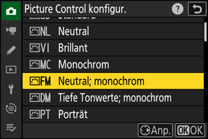 - [Neutral; monochrom] und [Tiefe Tonwerte; monochrom] wurden auch bei [Picture Control verwalten] im Fotoaufnahmemenü und Videoaufnahmemenü zu den Picture-Control-Konfigurationen, die den benutzerdefinierten Konfigurationen zugrunde liegen, hinzugefügt.